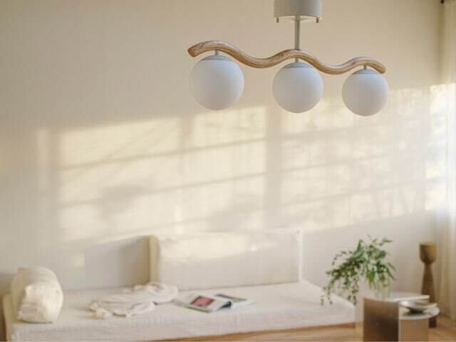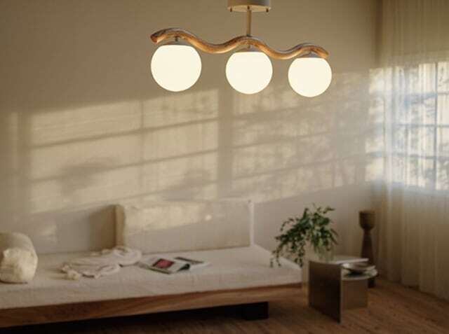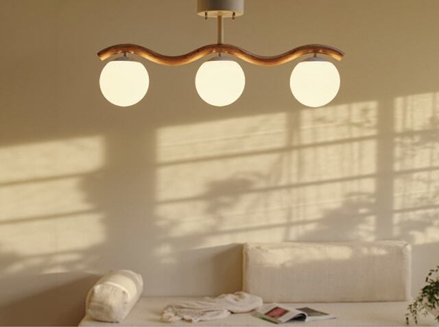 ウェービーなウッドアームと丸いホワイトガラスを組み合わせ、軽やかでリズミカルなデザインに仕上げたシーリングライトです。
