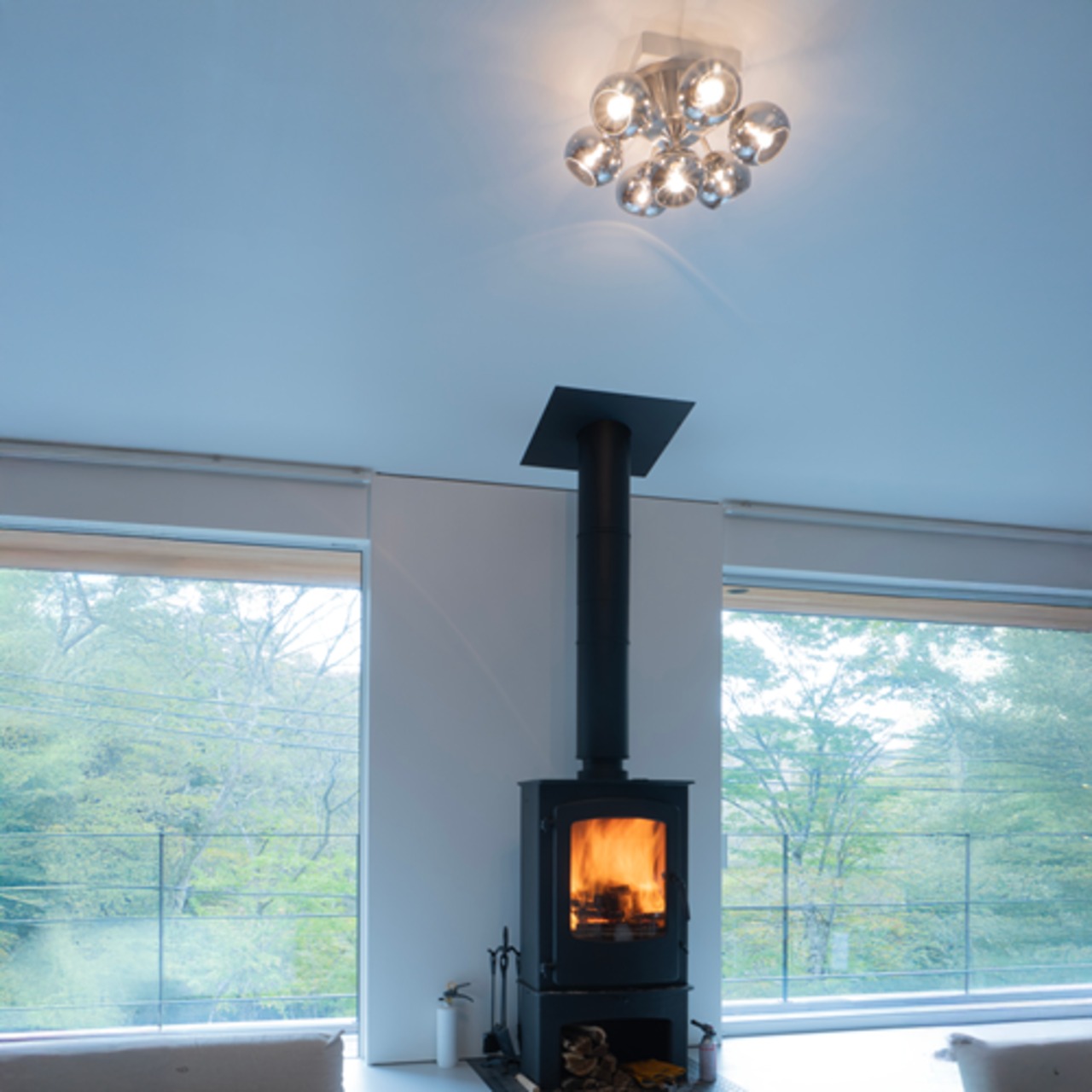 モダンなデザインのシーリングライト、6つの球状ランプで光を効果的に拡散。
